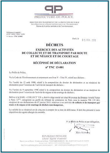 enregistrée au greffe du tribunal dè commerce de Paris sous le numéro 790 139 463, récépissé de ses déclarations du 07 janvier 2013,